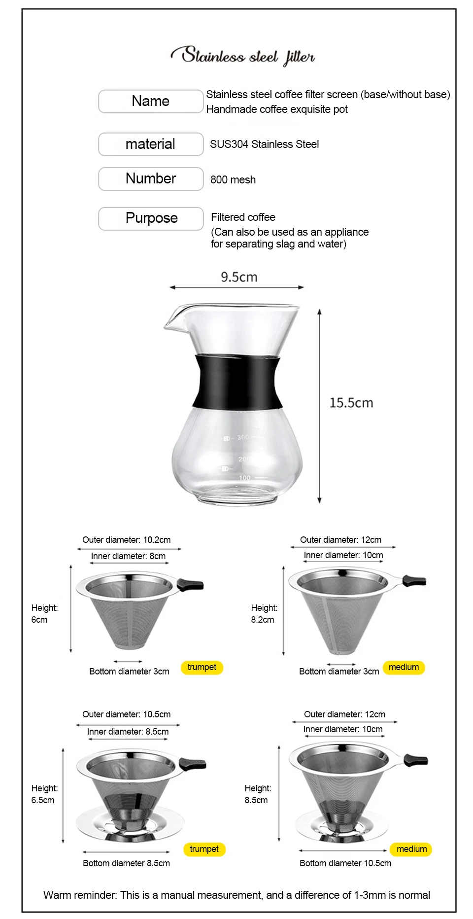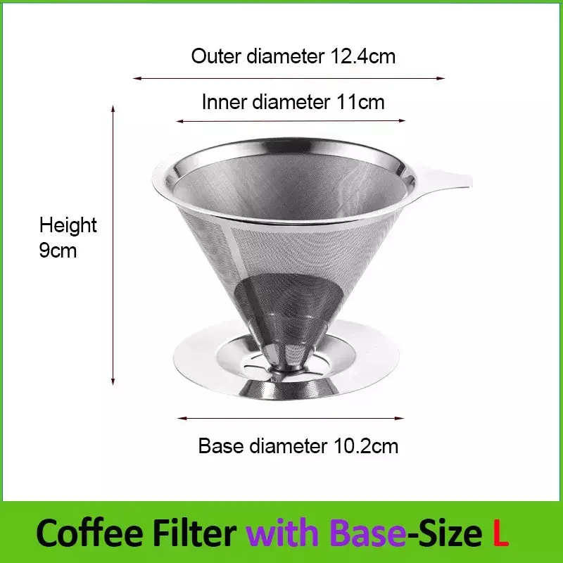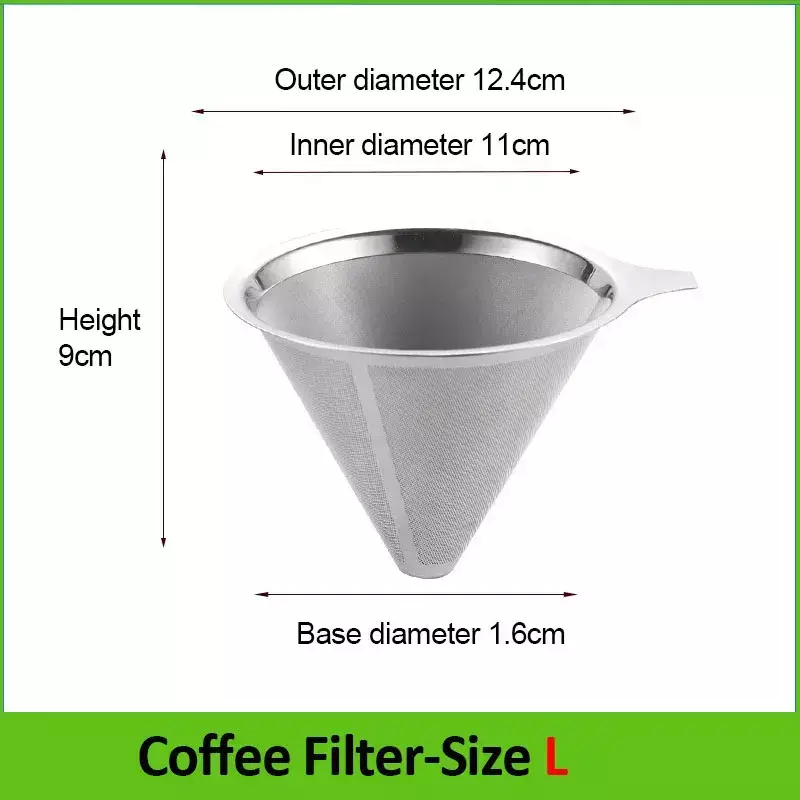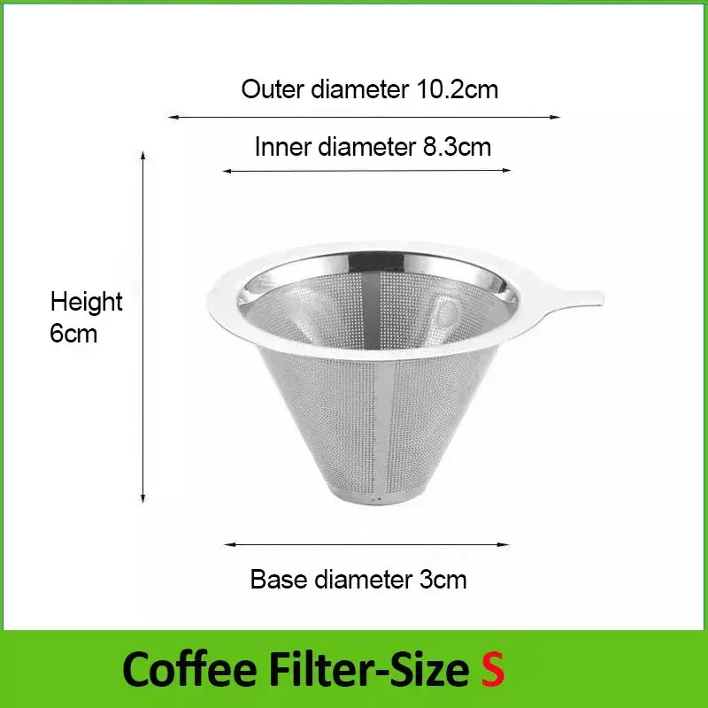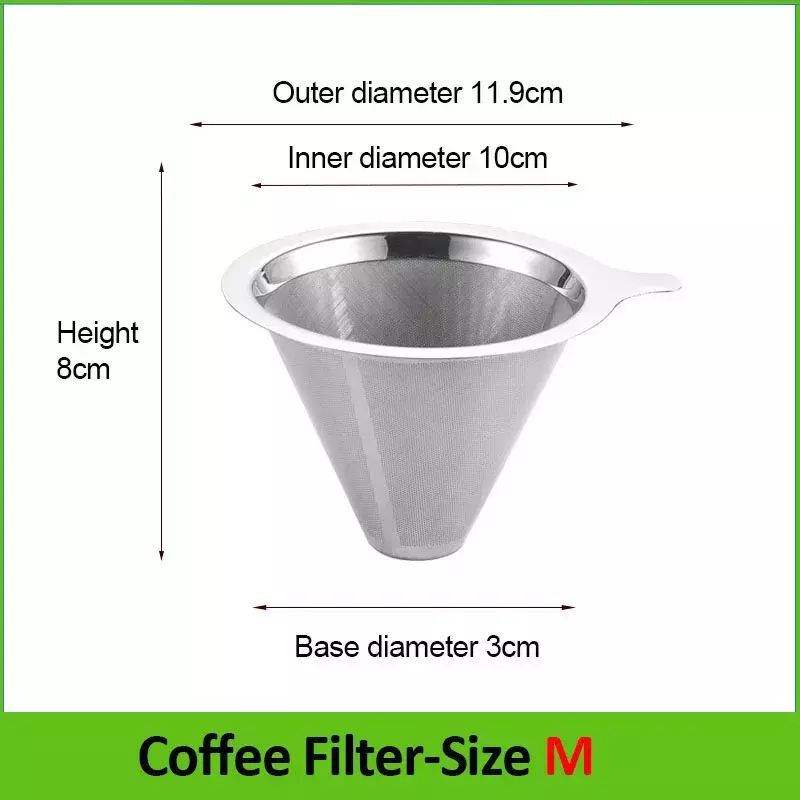 Filtro de café gotejador feito de material de aço inoxidável 304 de alta qualidade, não tóxico, seguro e durável de usar. Usando nosso este filtro do café, você pode obter uma xícara de café perfeita: O filtro de aço inoxidável da dupla camada não absorve óleos ou sabores dos grãos de café como filtros tradicionais, garantindo uma xícara saborosa de café em cada xícara ou panela pequena. Além disso, o cone de café de malha é projetado para caber na maioria dos copos, canecas, thermoses, potes pequenos e até mesmo jarros, conveniente para você usar. Bom produto a um bom preço, vale a pena comprar.